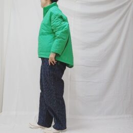 表地にナイロンを使用した中綿入りのノーカラーコート。