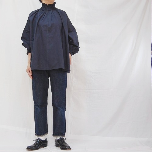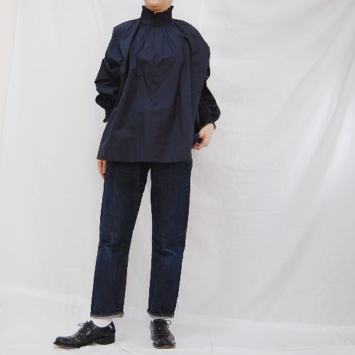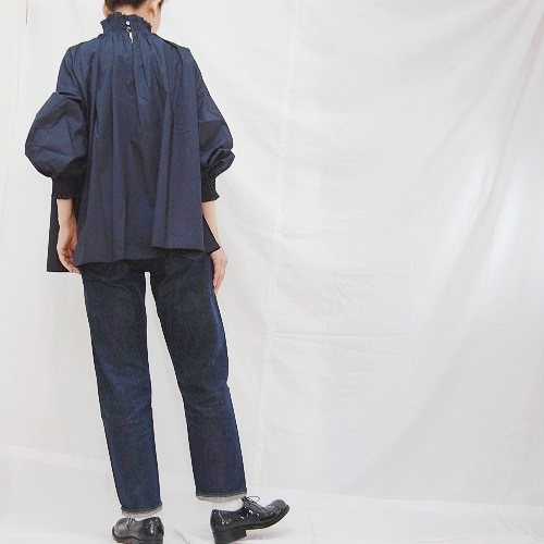 後ろ二つボタン開き、衿、袖口シャーリング、衿周り全体にギャザーを施しています。